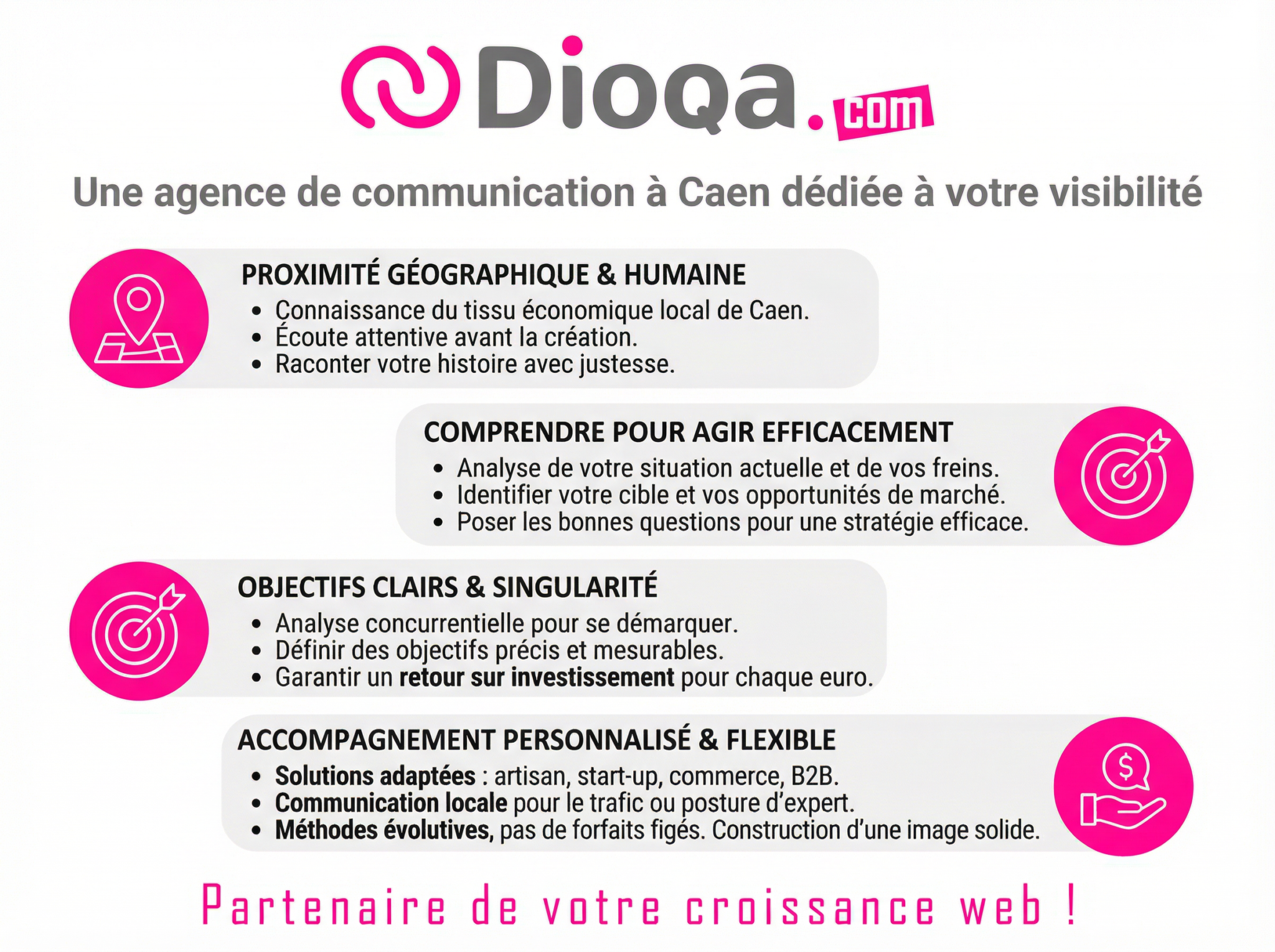 Chaque structure possède sa propre histoire. La vôtre mérite qu’on la raconte avec justesse. Notre rôle consiste à traduire vos idées en actions concrètes. Faire appel à une agence de communication à Caen vous permet de bénéficier d’une proximité géographique et humaine essentielle. Nous connaissons le tissu économique local, ses codes et ses attentes. Chez DIOQA, nous privilégions l’écoute avant la création.