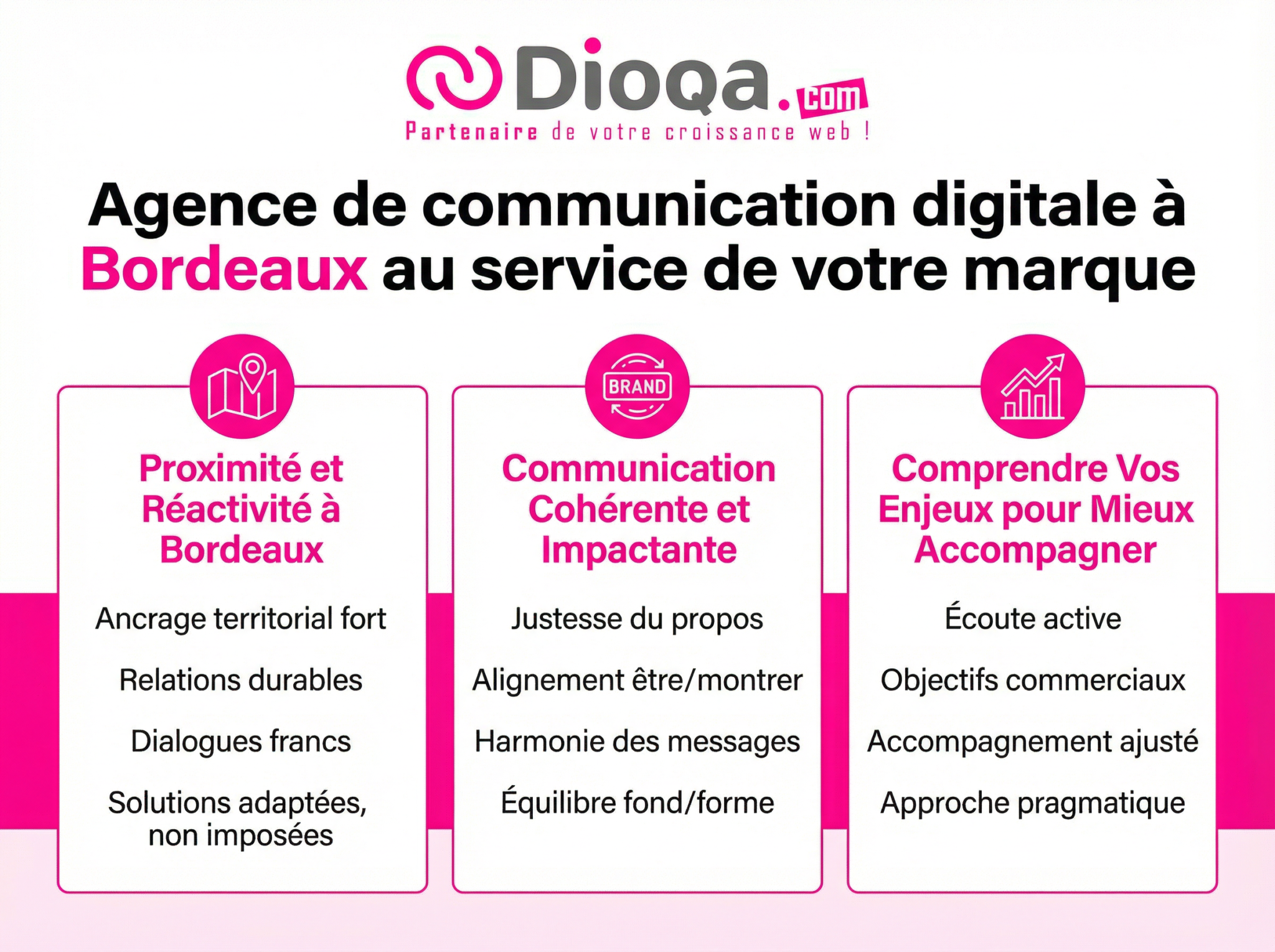 Dans un secteur où tout va très vite, prendre le temps de se poser les bonnes questions devient un luxe nécessaire.DIOQA se positionne comme un partenaire de proximité. Nous croyons que chaque structure, qu’elle soit une start-up locale ou une PME établie, mérite une attention particulière. Collaborer avec une agence de communication digitale à Bordeaux vous permet de bénéficier d’un ancrage territorial fort et d’une réactivité appréciable.